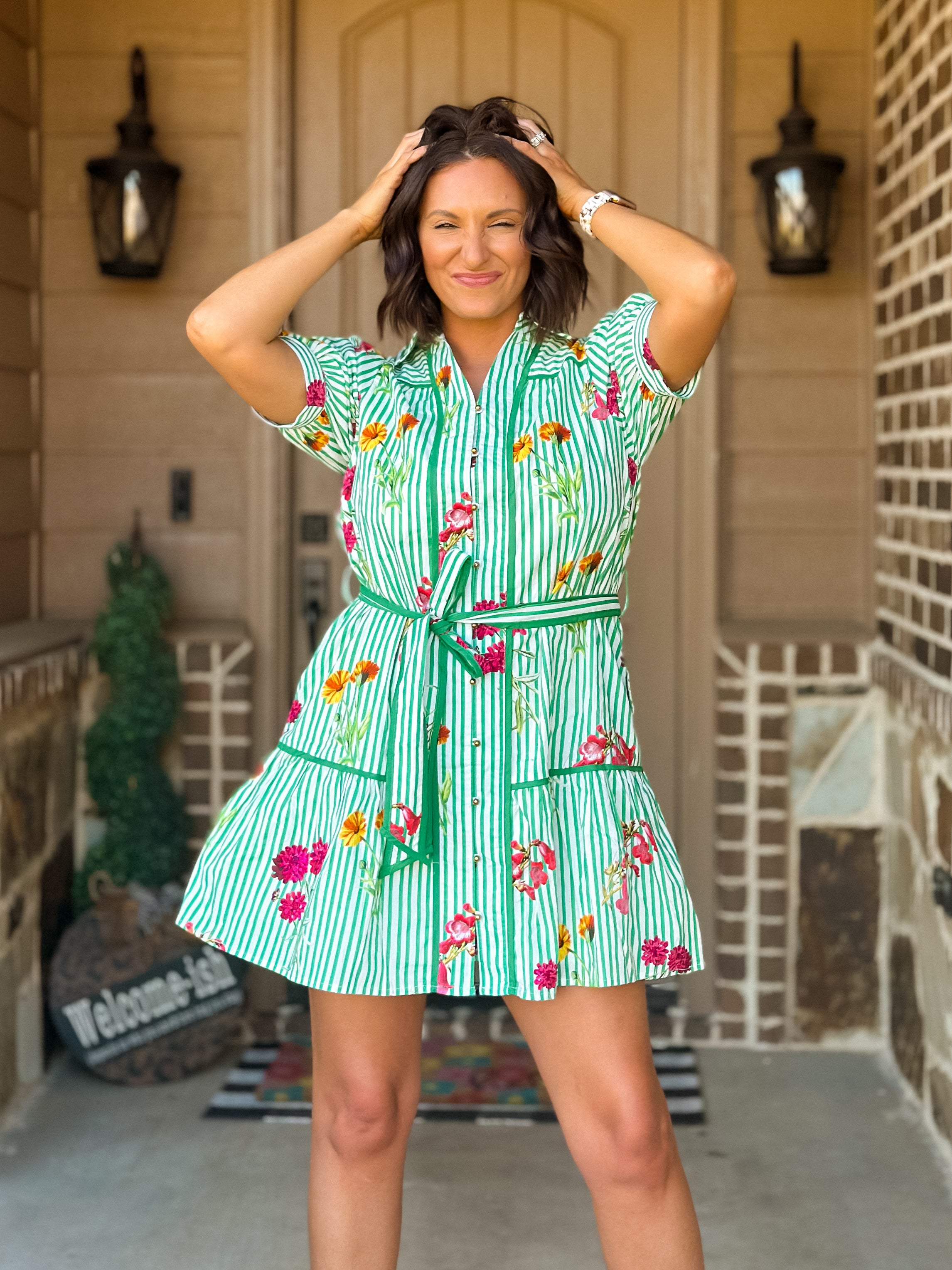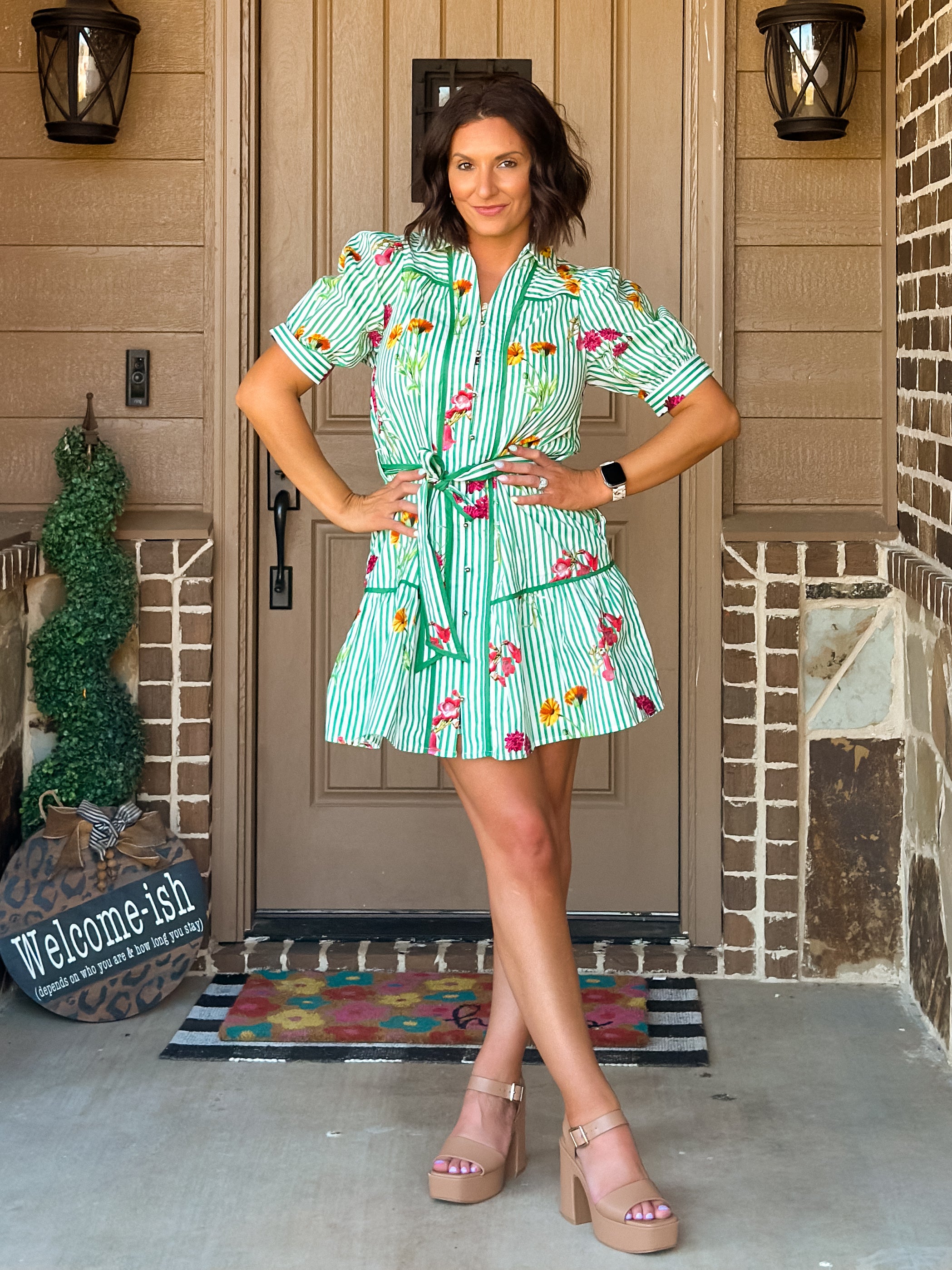 Green floral mini dress, striped puff sleeve dress, button front dress with belt, summer garden party attire, feminine short sleeve dress, preppy floral outfit, woven sundress with pockets.