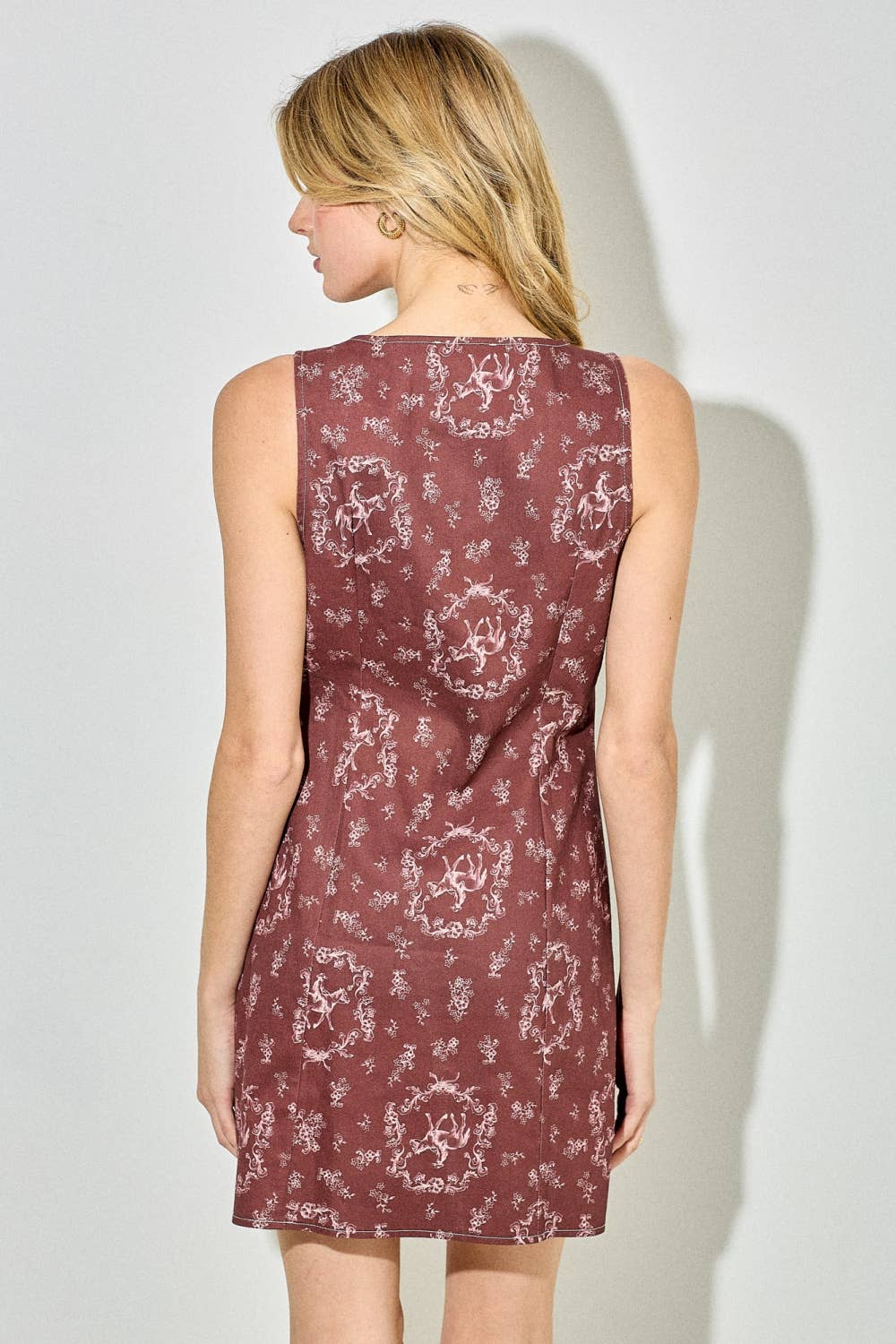 A dress that makes a statement without saying a word. Rich burgundy grounds a playful horse and floral print, while the classic A-line silhouette keeps things feminine and flattering. The sleeveless, button-down design makes it easy to style up or down, and the round neckline adds a clean, polished finish. It's the kind of print dress that feels fresh, confident, and completely unique.