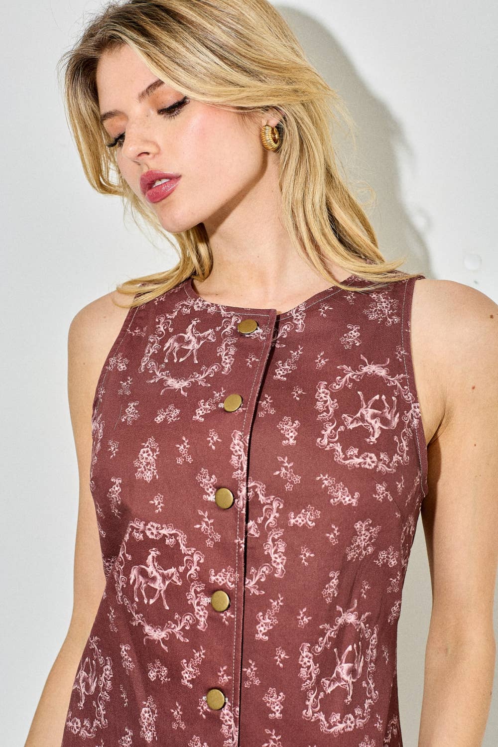 Details | Round Neckline, Sleeveless, Button-Down Front, Horse & Floral Print, Burgundy Colorway